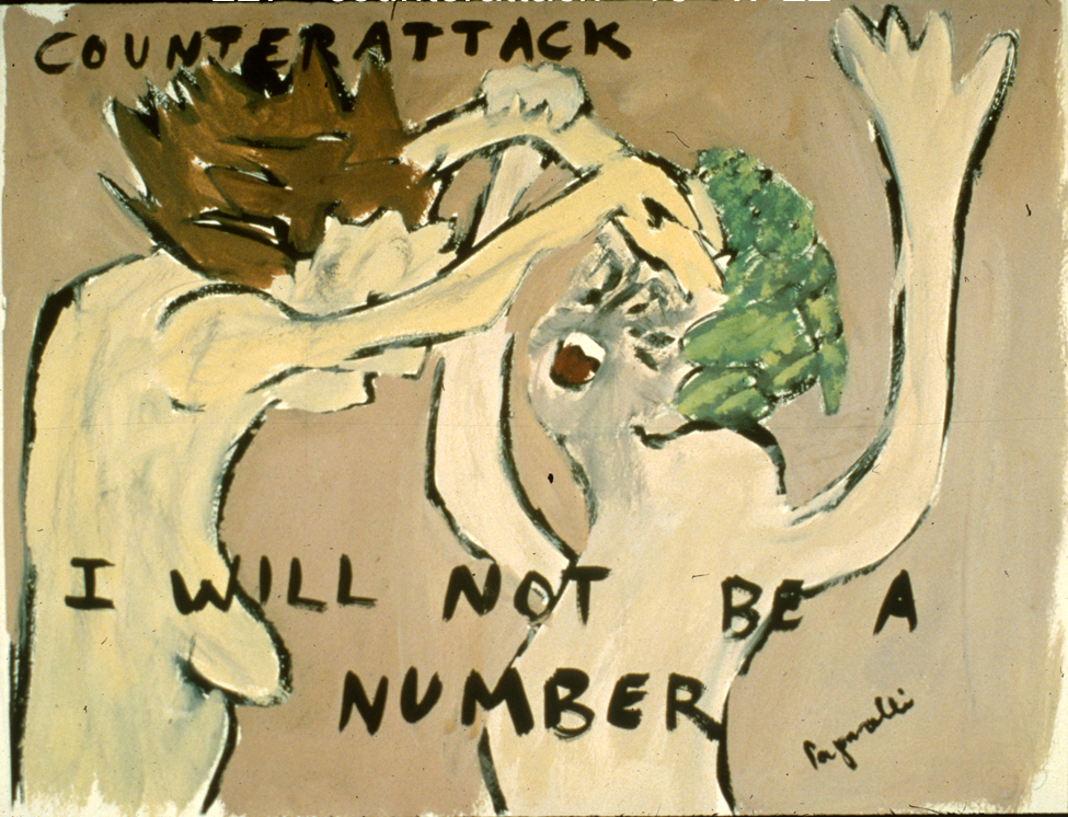 Janet Paparelli with Art Dart Board, an audience participation piece involving free, throwing darts, Oil and Collage on Particle Board and Silent Majority, Oil on Canvas, 70″ x 90″, both works, 1984)